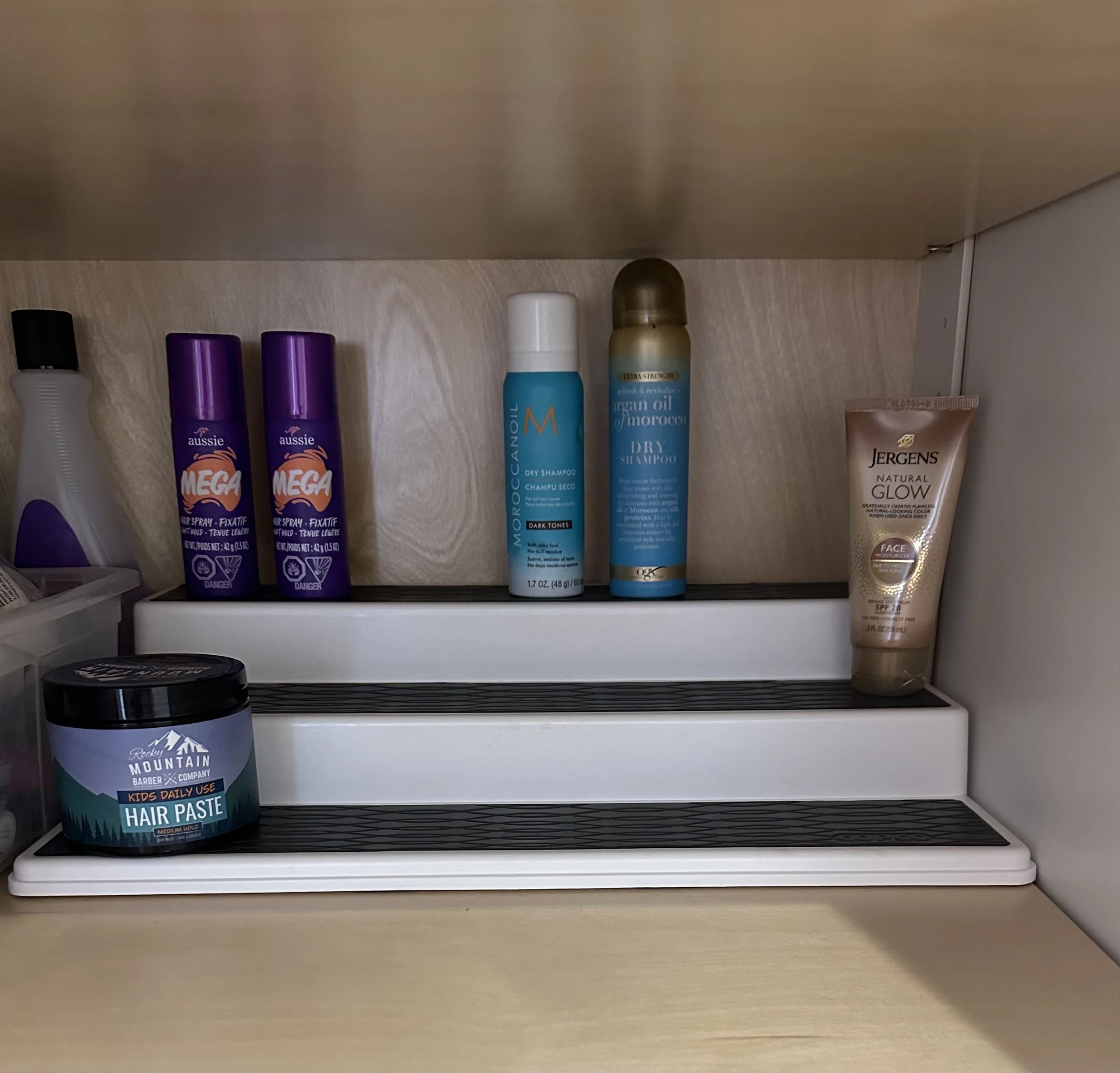 I’ve learned that mornings run smoother when everything is clearly communicated and easy to see. Instead of buying specialty drawer dividers, I used simple silverware trays to organize the boys’ bathroom drawers, giving each toothbrush, toothpaste, floss, and mouthwash a clearly defined place. Inside our cabinets, inexpensive spice racks do the same thing vertically—elevating items in the back so nothing gets lost and every inch of space is used. Together, these small, affordable solutions eliminate clutter, prevent overbuying, and create a layered, intentional look that feels functional, and easy to maintain.