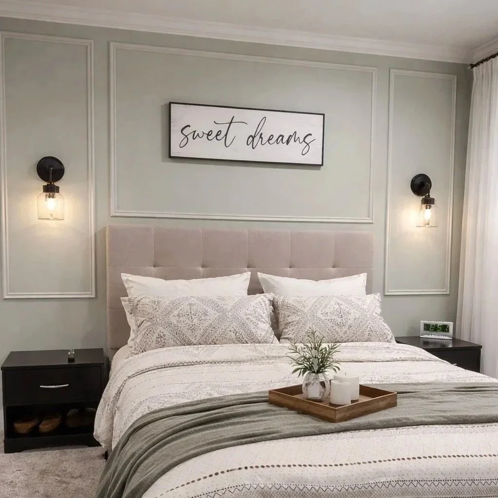 Once the molding was fully dried, I painted all of the pieces to match the wall color (SW 6191) for a seamless, built in look. Next comes the fun part, which is styling the space. I installed new wall sconces to add warmth and sophistication, then layered in fresh bedding for extra texture and contrast. The chocolate microfiber sheets were a great find — soft, high quality, and budget-friendly — while the comforter introduced just the right amount of pattern to complete the room.